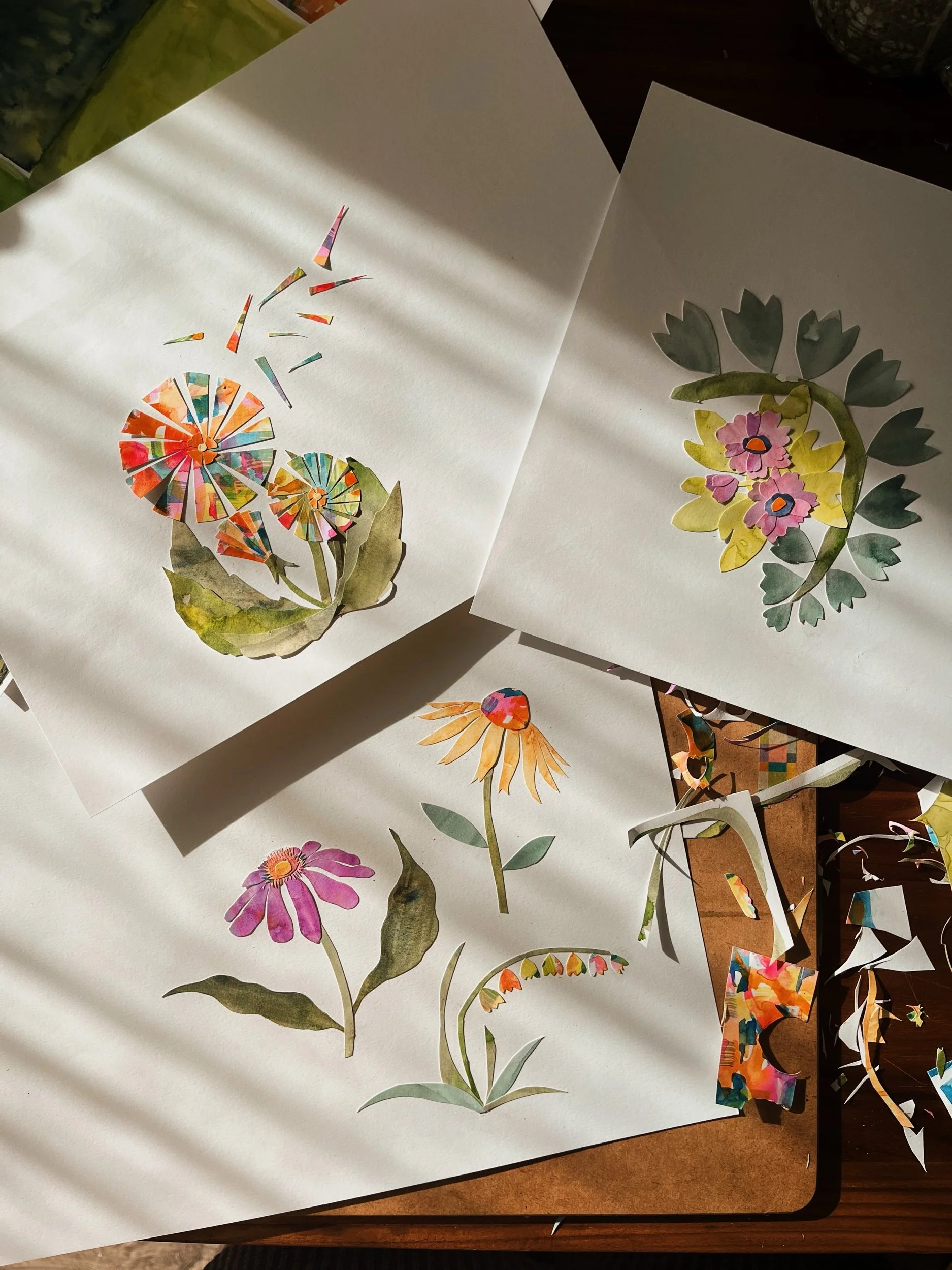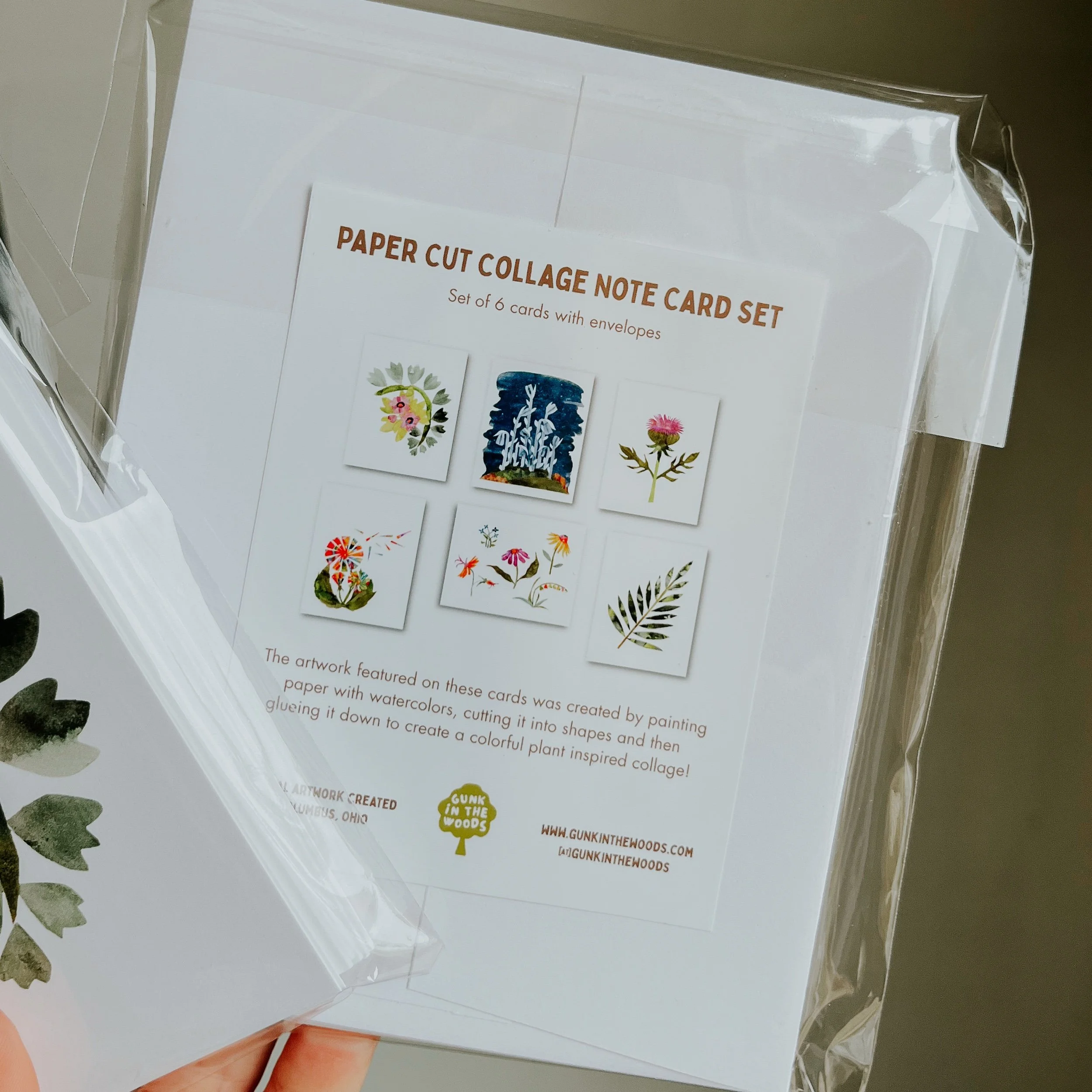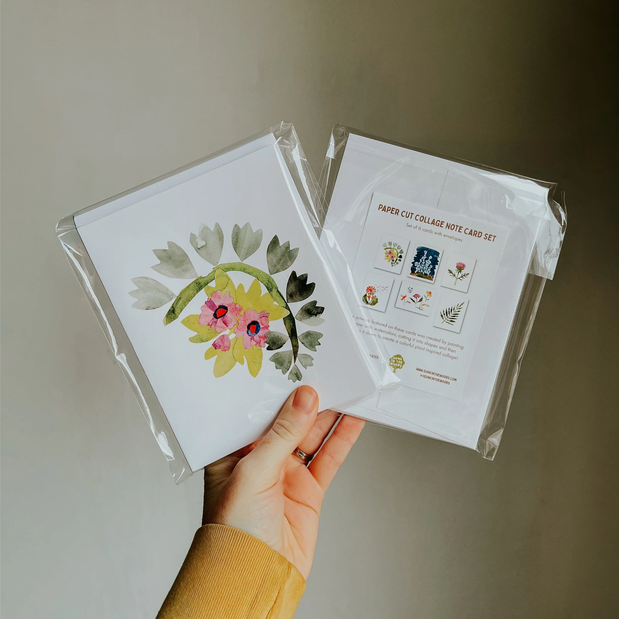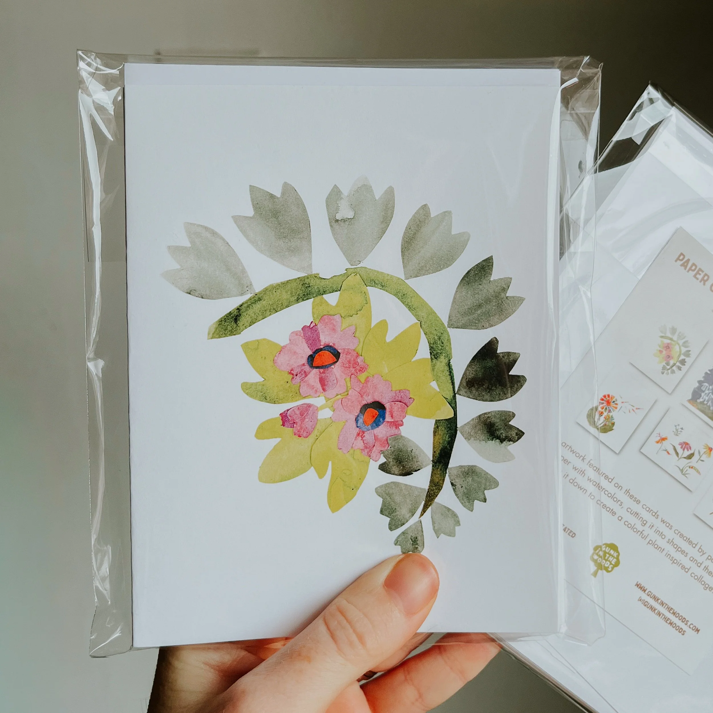 The artwork featured on these cards was created by painting paper with watercolors, cutting it into shapes and then glueing it down to create a colorful plant inspired collage!